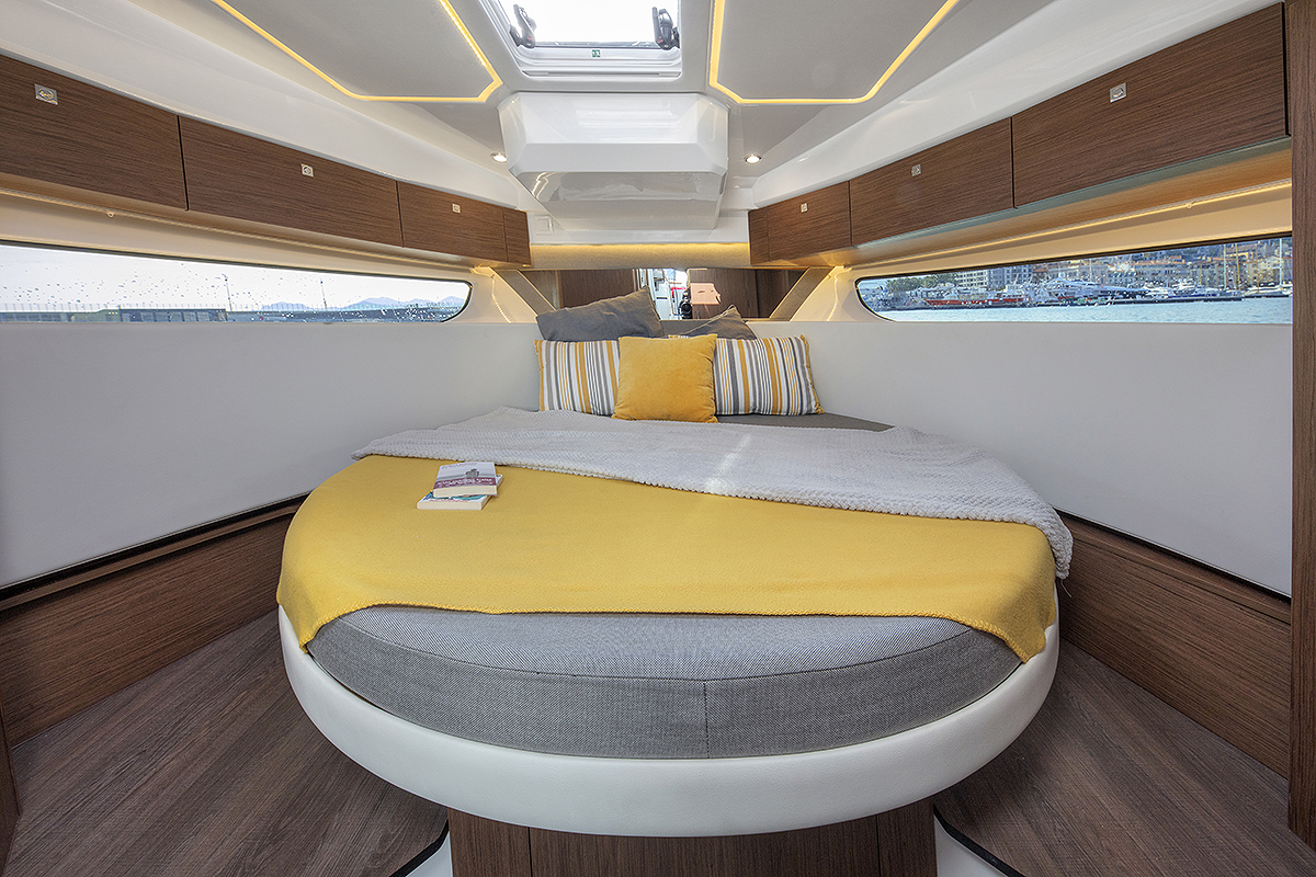 Master kabina je srce ovog plovila, smeštena skroz napred radi maksimalnog komfora. Prostrani bračni krevet sa bočnim prolazima nudi luksuz i praktičnost. Osim toga, kabina ima i stepenike sa svake strane, omogućavajući laku navigaciju unutar kabine. Prirodna svetlost obasjava prostor kroz prozore na plafonu i bočno, stvarajući svetlu i prijatnu atmosferu. Dodatni skladišni prostor ispod kreveta omogućava efikasno korišćenje prostora, dok vratanca na prednjoj strani omogućavaju brz pristup skladišnom prostoru.