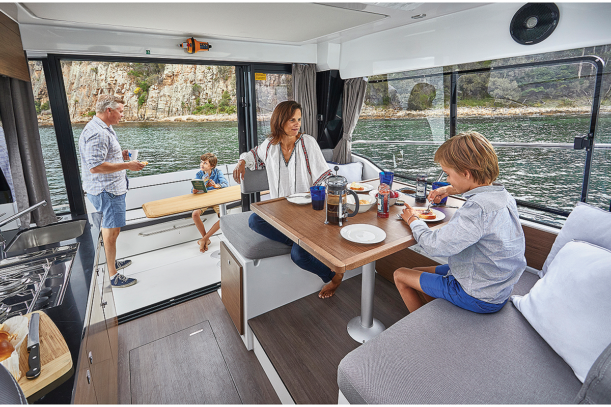 Na suprotnoj strani se proteže prostrana kuhinja sa velikom radnom pločom, na kojoj je elegantno integrisana sudopera i gasni rešo sa dva gorionika. Odeljci za odlaganje stvari se nalaze ispod radne ploče, što omogućava maksimalno iskorišćenje prostora. U prednjem delu salona se nalazi upravljački deo sa kapetanskim sedištem, dok se pored njega nalazi dodatni izlaz iz kabine za lakše manevrisanje prilikom pristajanja. Spuštanjem dva stepenika iz unutrašnjeg salona stižete u udoban spavaći deo, gde se možete opustiti i odmoriti nakon uzbudljivog dana na vodi.
