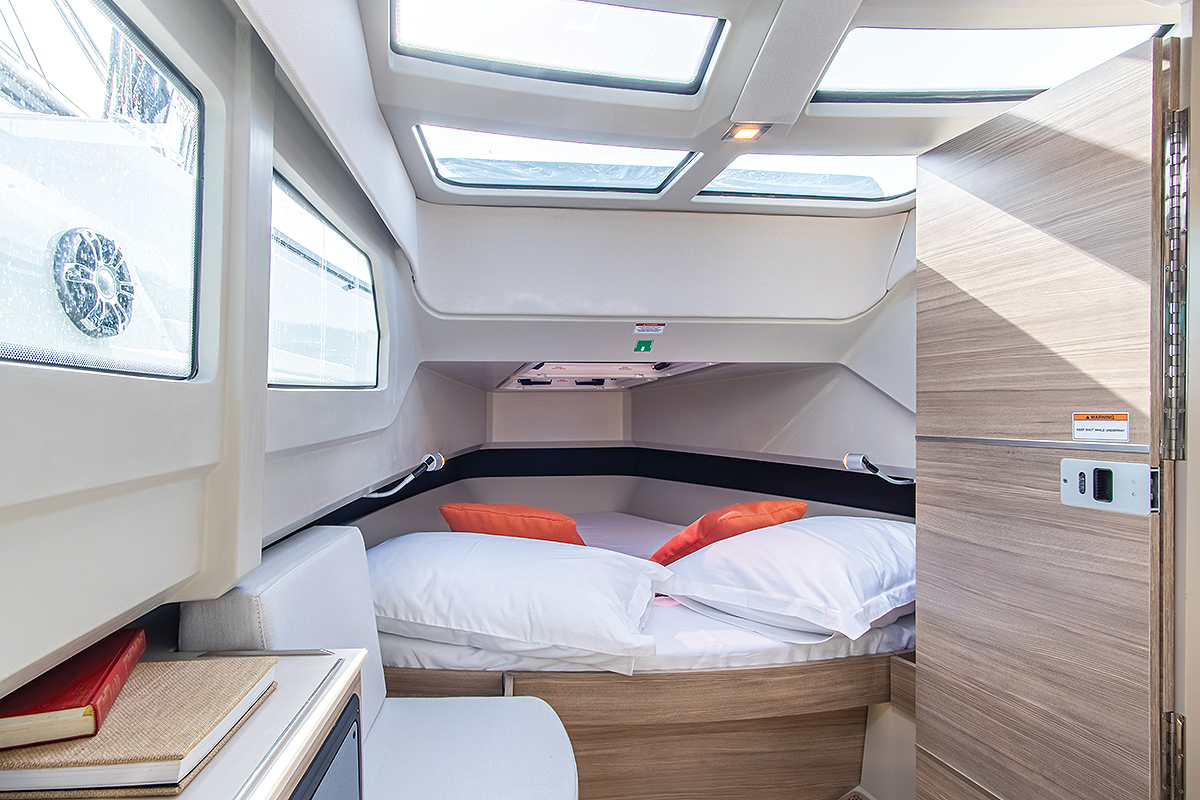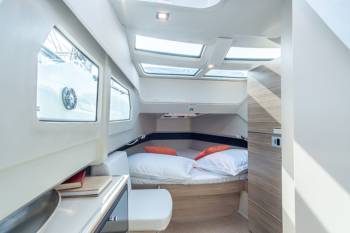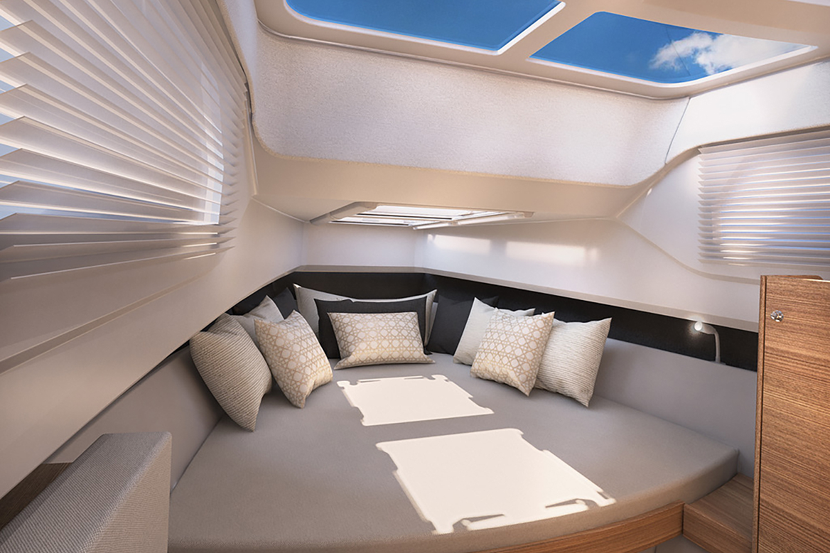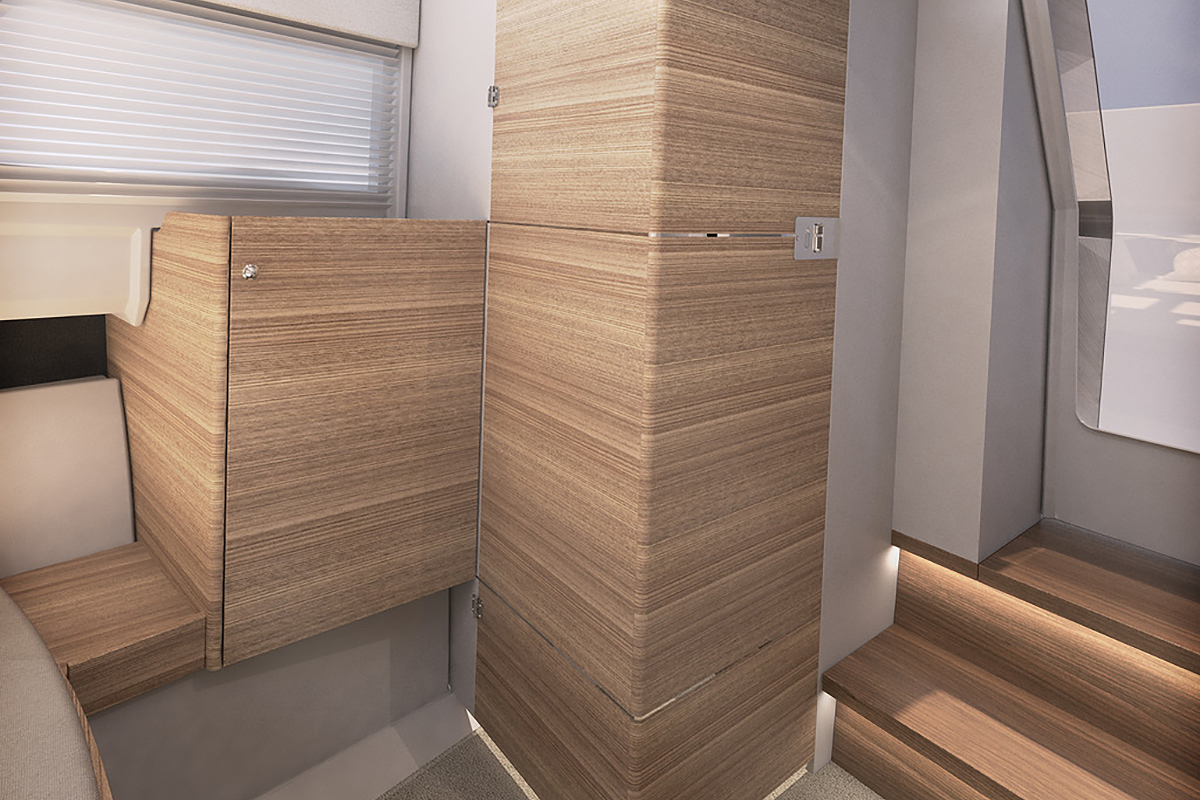 Svestranost kokpita je posebna karakteristika. Bočne terase koje se otvaraju stvaraju nenadmašnu vezu sa vodom. Sa podesivim naslonima za leđa dobijate mogućnost da promenite raspored sedenja i potpuno transformišete brod. Zadnja klupa se preklapa unapred čime se dobija još jedna velika udobna garnitura za sunčanje, ili možete da preklopite naslon drugog reda sedišta i dobijete „separe“ sa dve klupe i stolom na izvlačenje između. Ispod sedišta ima mnogo prostora za odlaganje opreme, a zadnja klupa se otvara preko električnih aktuatora i omogućava pristup baterijama i instalacijama ispod palube.