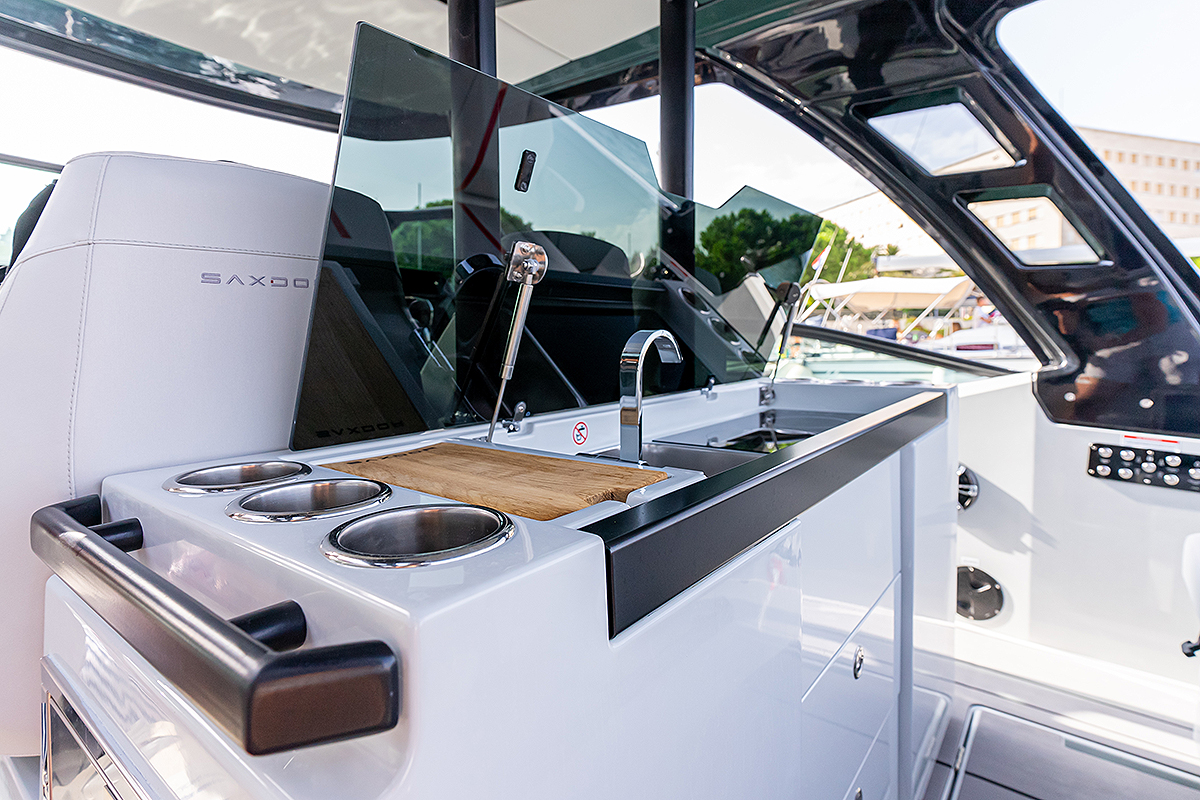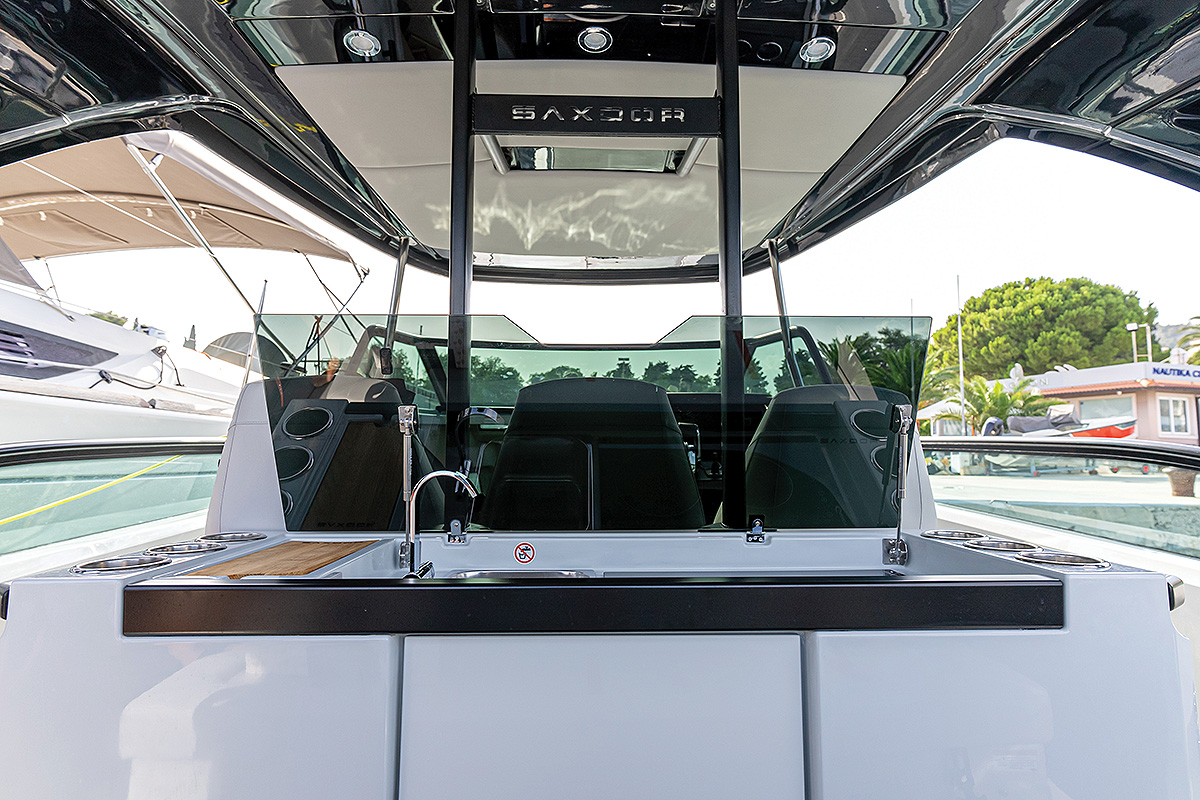 kompanije Saxdor, tako da su digitalne kontrole i volan pozicionirani tako da omoguće udobnu vožnju, a za dodatno pojednostavljeno upravljanje tu su Mercury JPO džojstik, automatski flapsovi i pramčani propeler. Staklena komandna tabla na upravljačkoj konzoli sa dva Simrad ekrana od 12 inča sadrži navigaciju i sonar, kao i Fusion paket za zabavu spreman za žurke na brodu ili opuštenu muziku za relaksiranje na vodi.