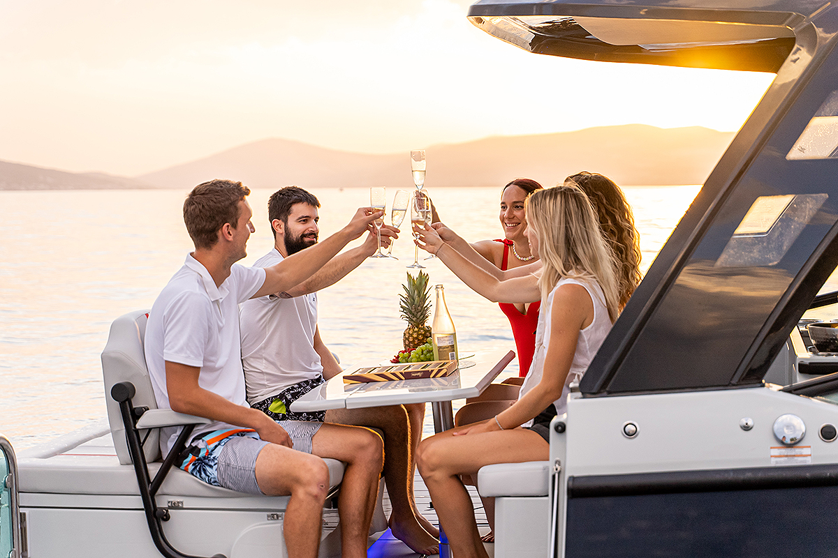 Osposobljen da primi 9 osoba, njegova konfiguracija sedišta iza upravljačke konzole u redovima od po tri sedišta definitivno se izdvaja i zapada za oko. Osećaćete se kao da ste kročili na fensi adrenalinski brod. Svako može udobno da se zavali i bezbedno uživa u plovidbi do raznih ostrva i plaža tokom celog dana.