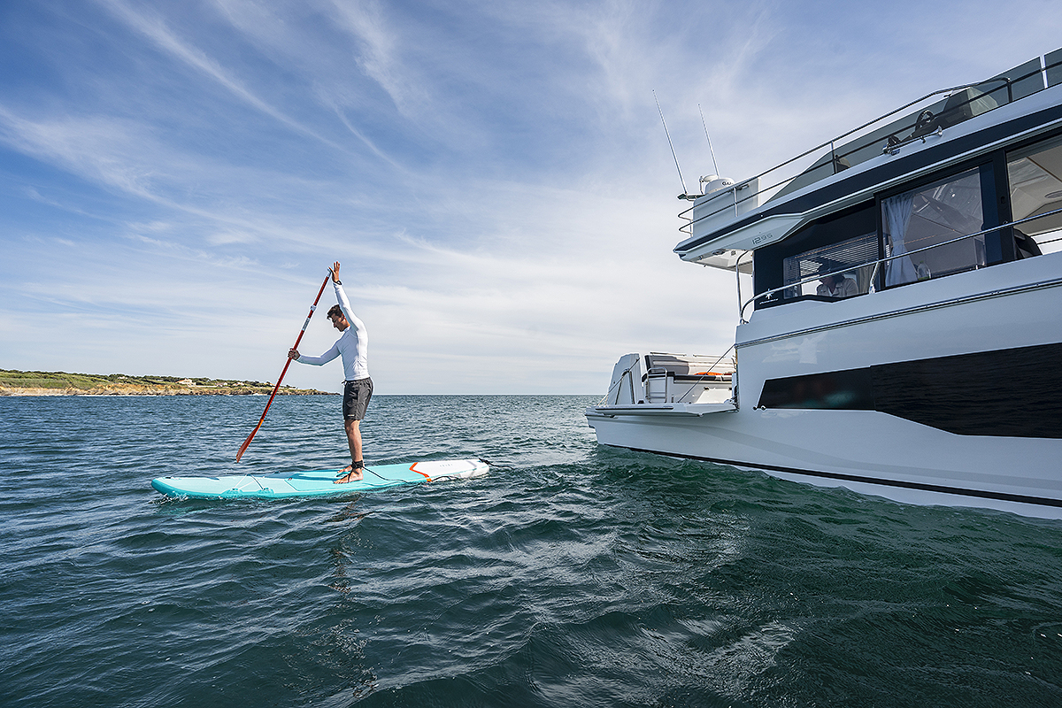 Između kokpita i salona nalaze se velika staklena vrata koja se mogu ostaviti otvorenim. Kuhinja sa leve strane obezbeđuje kontinuitet sa eksterijerom, prvenstveno zato što sadrži i bar. Ona ima svu neophodnu oprmeu: ugradnu ploču, rernu, frižider, sudoperu i ormariće. Što se ostatka salona tiče, tu je ugaona garnitura, kao i upravljačka konzola sa desne strane sa čistim pogledom pored koje su vrata koja dodatno olakšavaju kretanje po brodu. Na komandnoj tabli opciono se nalaze dva GPS ekrana, džojstik i autopilot… Koncept svetla takođe je pristuan i u enterijeru koji se sastoji od tri kabine ispod palube, od kojih svaka ima po dva ležaja tj. ukupno šest, a selekcija savremenih i uglađenih materijala se presijava zahvaljujući sunčevom svetlu koje ulazi kroz velike prozore.