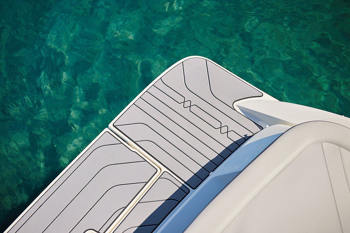 Na desnoj strani postoji dodatno sedište iza kokpita. Ovo je lepo dimenzioniran kokpit sa standardnim 7 Simrad digitalnim ekranom i VesselView sistemom upravljanja na brodu, koji prikazuje podatke o performansama broda i motora. Fusion Apollo SRXX400 audio sistem sa ekranom osetljivim na dodir je na brodu kao standard, kao i Bluetooth i Apple AirPlay2. Kao opciju, možete odabrati Fusion Premier sistem sa pojačalima, subwooferom i zvučnicima Signature serije.
