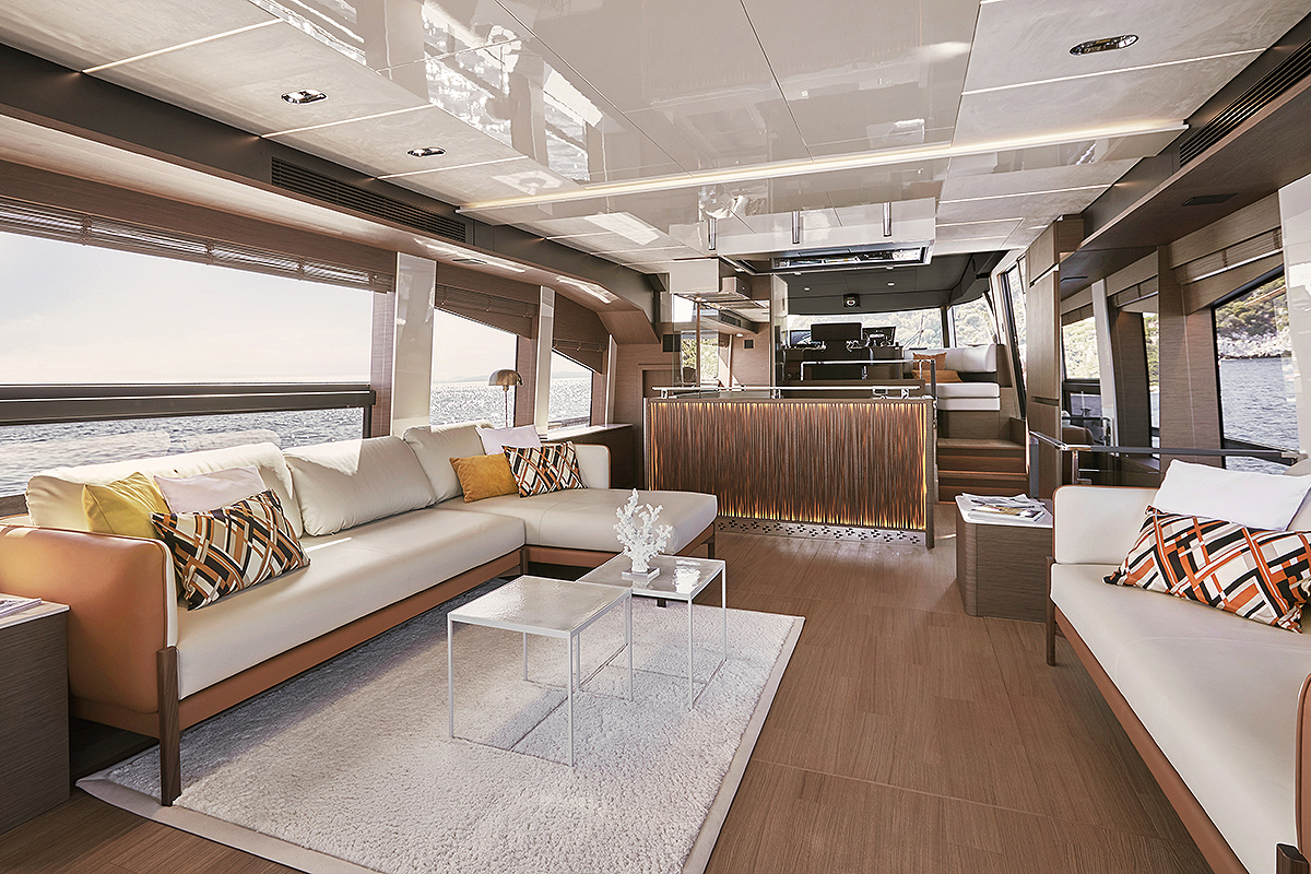 Unutrašnji prostor X70 je umetnost u dizajnu. Glavni salon se prostire celom širinom jahte, donoseći prirodno svetlo kroz velike staklene plohe i omogućavajući nevjerovatan pogled na okolinu. Centralno pozicionirana kuhinja je srce glavne palube, pružajući jednostavan pristup flybridge-u za uživanje u provodu na otvorenom.