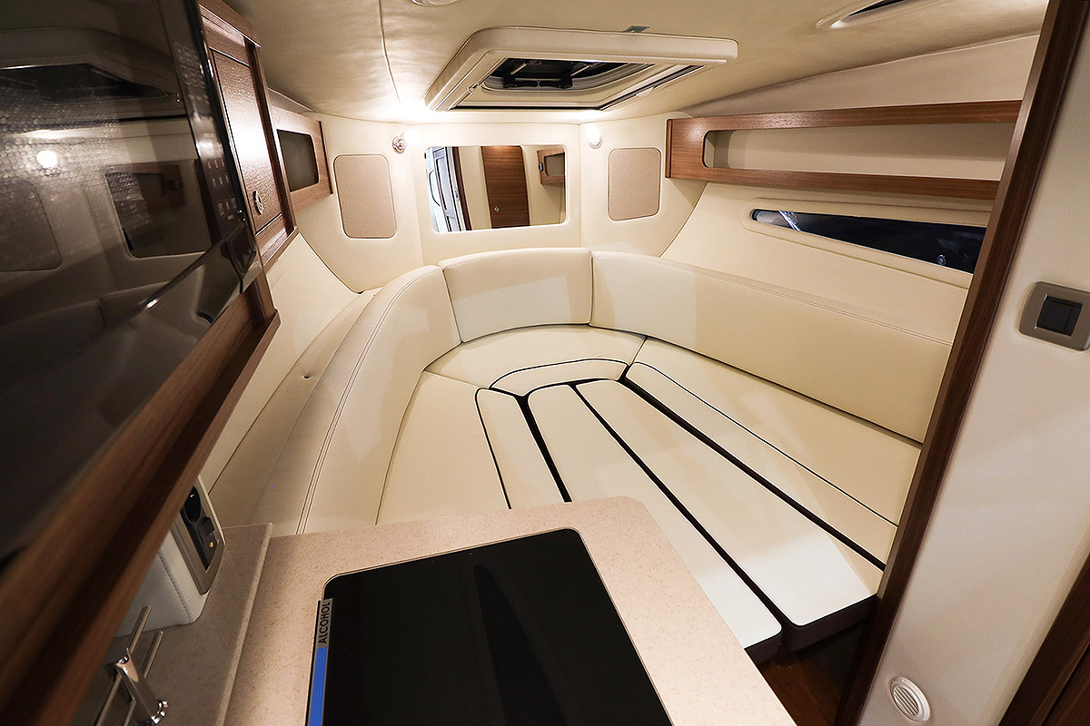 Garnitura sa leve strane, dva sedišta za upravljačkom konzolom i klupa sa desne strane nude dovoljno sedećih mesta za osam ljudi. Tu je i bar sa sudoperom, pregršt držača za čaše i sto od tikovine na izvlačenje na krmi. Jedna zgodna funkcija na modelu 265 je to što je naslon na zadnjoj klupi podesiv te klupa može da se transformiše u veliku ležaljku za sunčanje. To je takođe odlično mesto za sedenje dok čekate ribu da zagrize.